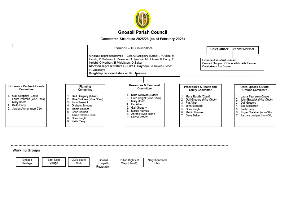 A statutory annual meeting is held in May at which the Chair and Vice Chair of Council are elected by the Council members at the start of the civic year (which runs from May to April). Gnosall Parish Council has three employees – the Clerk, the Council Support Officer and Cleaner/Caretaker. The decisions of the Parish Council are carried out by the Council’s staff, led by the Clerk.